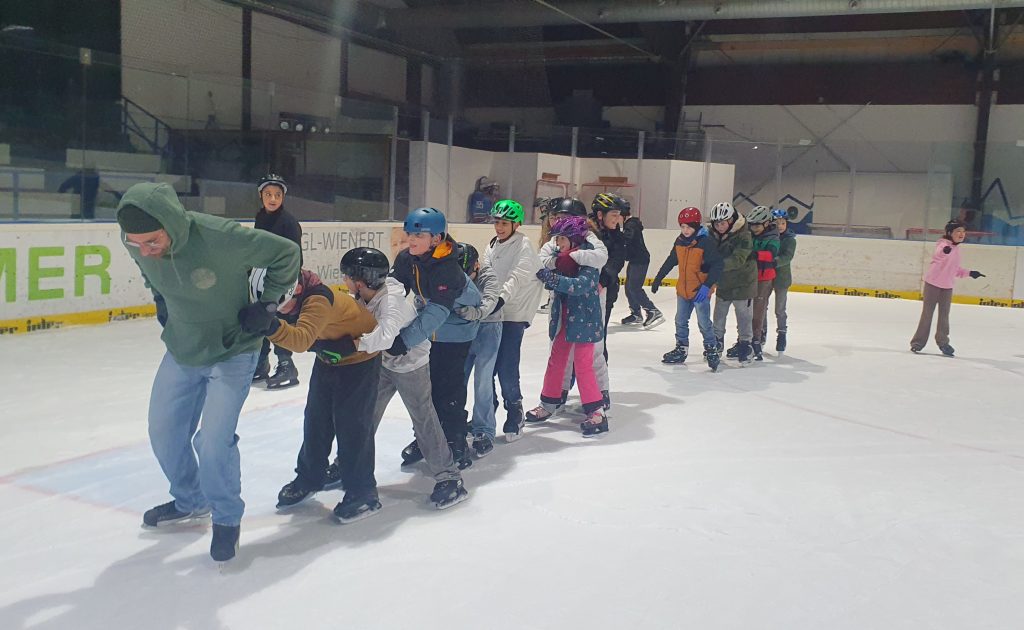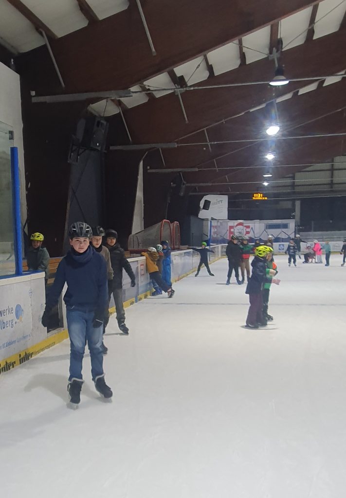 Nachdem alle Schülerinnen und Schüler ihre Schlittschuhe geschnürt hatten, ging es ab auf die Piste. Nach zwei Stunden auf dem Eis konnten auch diejenigen, die zum ersten Mal auf dem Eis standen, flotte Schritte über die Eisfläche machen.
